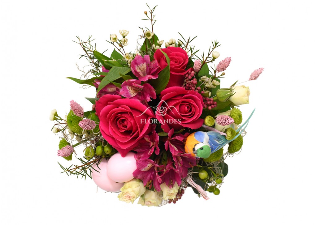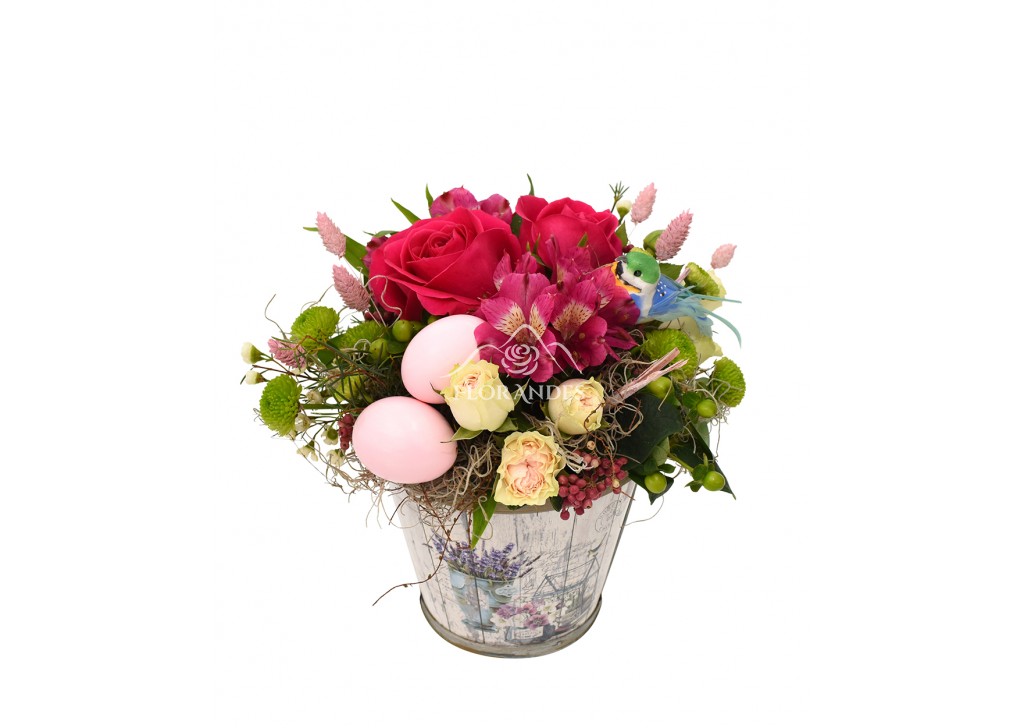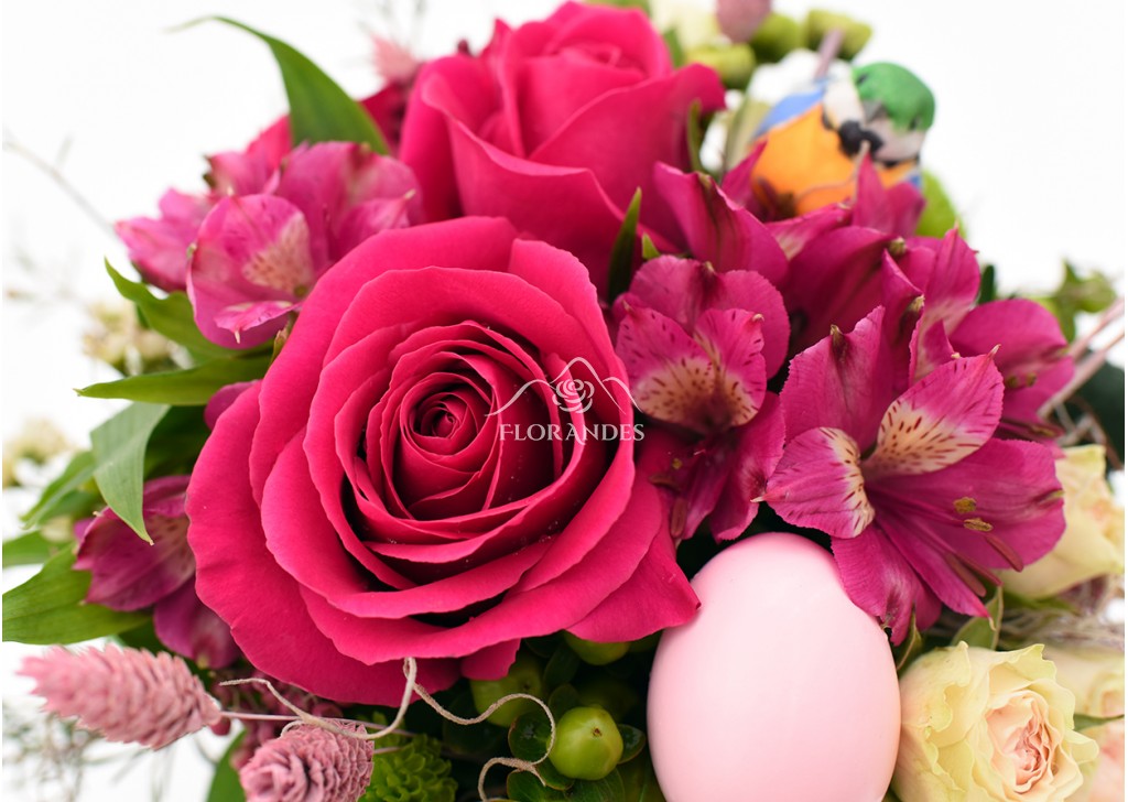 Aranjament floral cu trandafiri si alstroemeria, special pentru sarbatorile Pascale. Aranjamentul este compus din 3 trandafiri ciclam, 1 minitrandafir roz pal, 2 alstroemeria mov, 1 santini verde, 2 hypericum verde, 1 wax flower, 5 flori roz uscate, 2 crengute de boabe de piper roz, 2 frunze de ruscus, tillandsia, 1 figurina pasare si 2 oua decorative. In functie de disponibilitate, vasul poate fi diferit de cel din imagine.