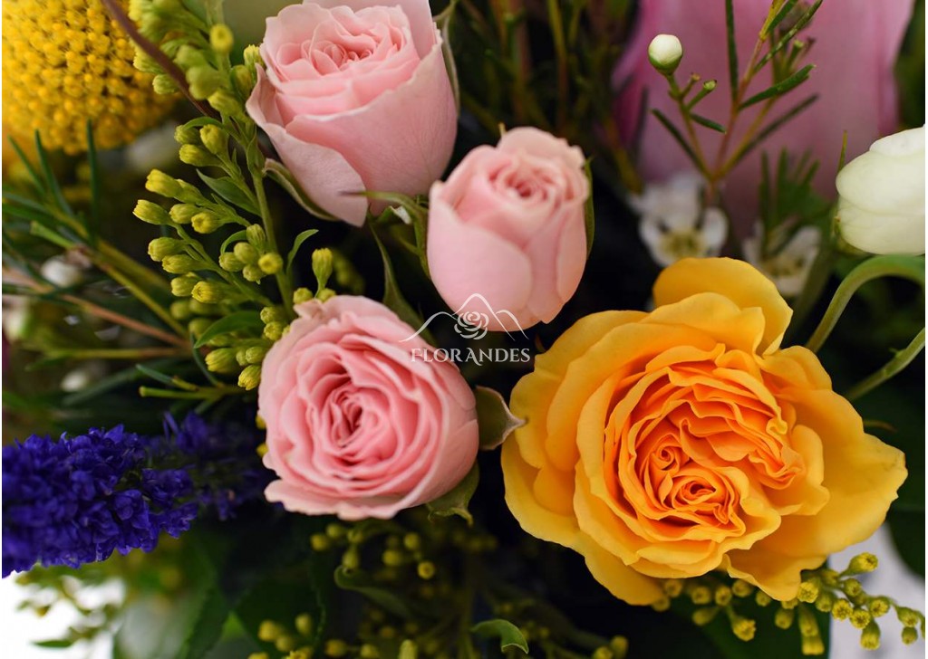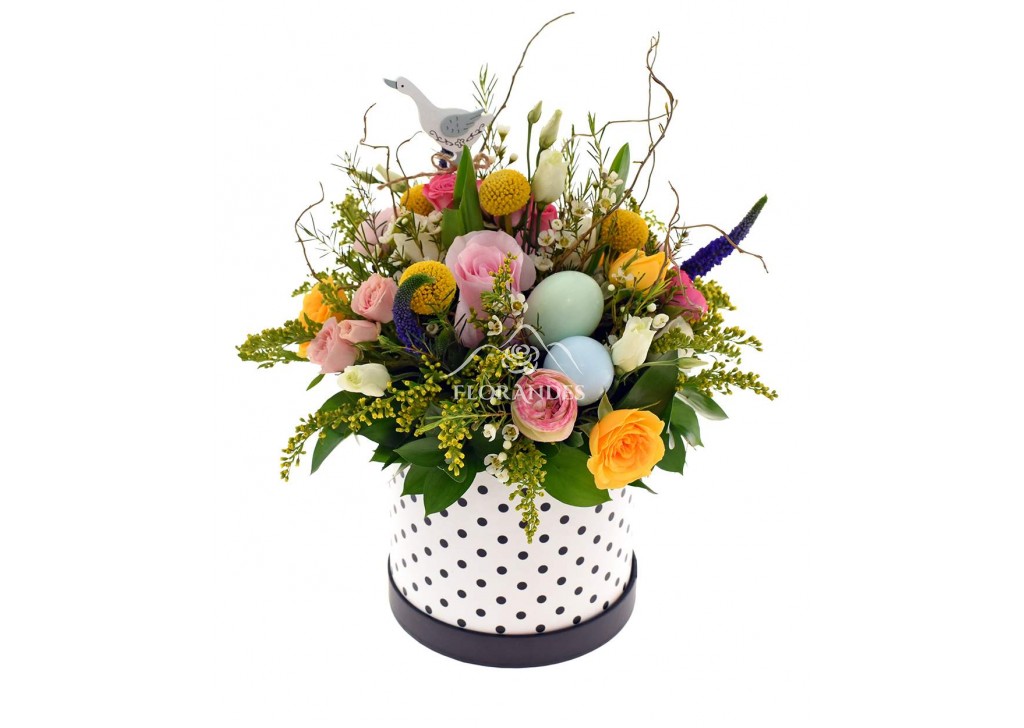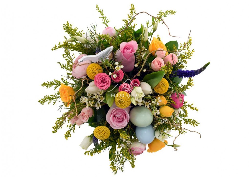 Aranjament floral cu minitrandafiri si ranunculus, delicat si cochet, o explozie de culoare si veselie. Este un cadou floral ideal pentru Pasti care va insenina ziua oricui si care va lumina privirile. Aranjamentul este compus din 2 minitrandafiri galbeni, 2 minitrandafiri roz pal, 1 minitrandafir ciclam, 2 trandafiri roz, 2 lisianthus alb, 4 ranunculus roz, 3 veronica mov, 4 craspedia, 2 wax flower, 2 solidago, 5 frunze ruscus, 1 crenguta salcie, 2 oua decorative, 1 figurina gasca lemn, cutie de carton. In functie de disponibilitate, culoarea cutiei poate fi diferita de cea din imagine.