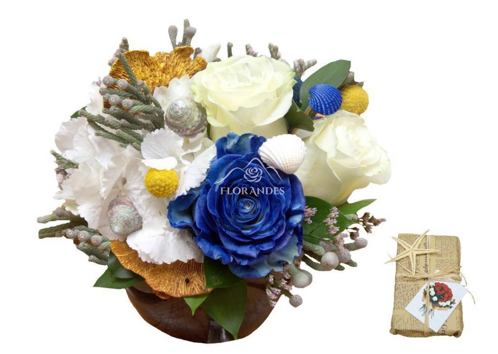 Aranjament floral inedit, cu o nota marina, care sigur va bucura pe oricine il va primi. Aranjamentul este compus din 1 hortensie alba, 2 trandafiri albi, 1 trandafir albastru, 3 brunia, 2 craspedia, limonium, frunze decorative, scoici si alte elemente decorative marine.
