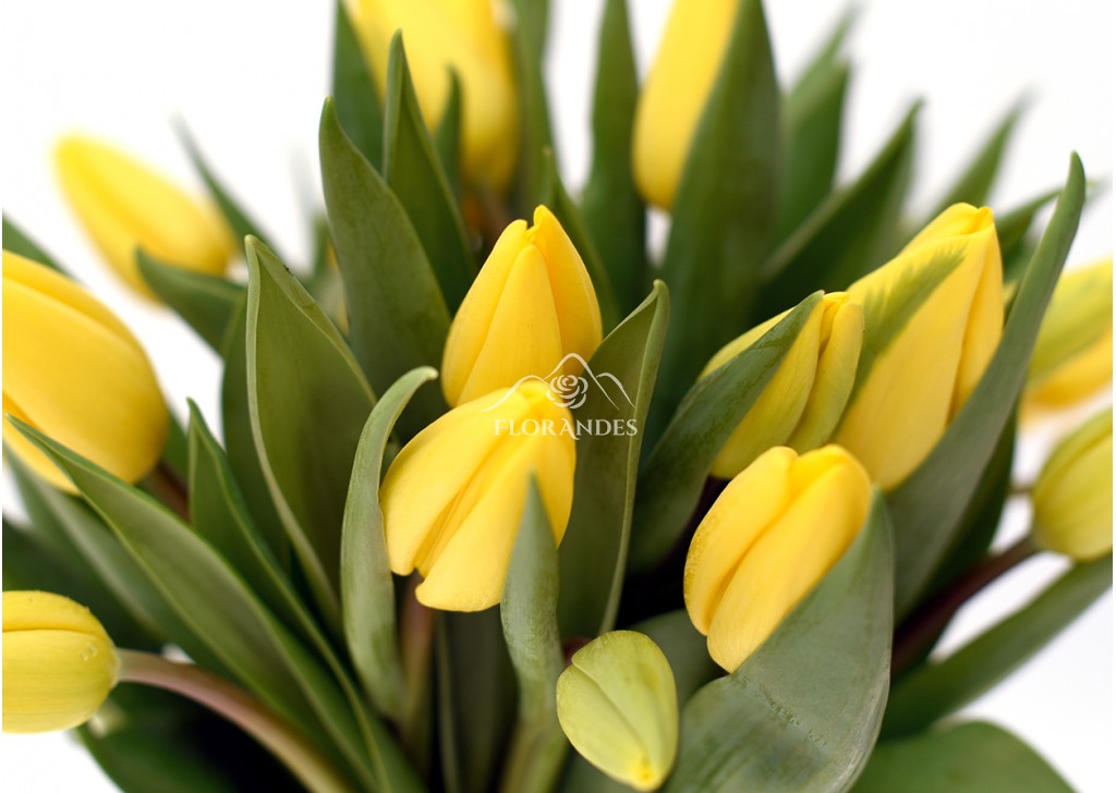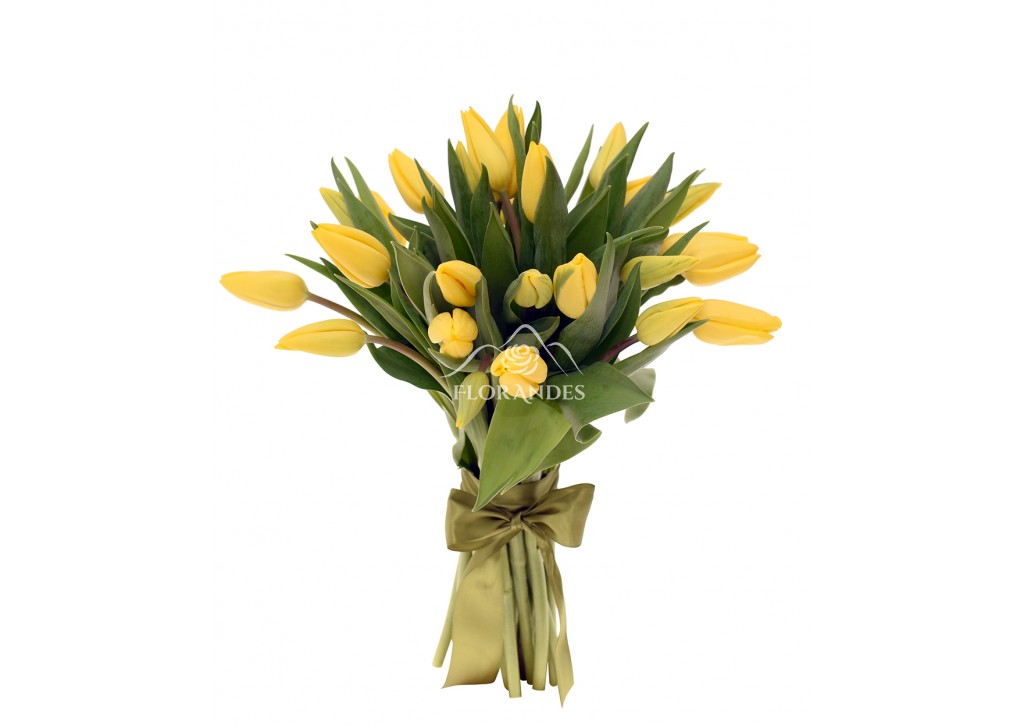 Buchet 25 lalele galbene, un cadou de primavara luminos si delicat, simbol al bucuriei si optimismului. Comanda online un buchet de lalele si insenineaza ziua cuiva, daruindu-i un motiv sa zambeasca. Florile sunt completate frumos de o fundita din satin si 1 frunza de aspidistra.