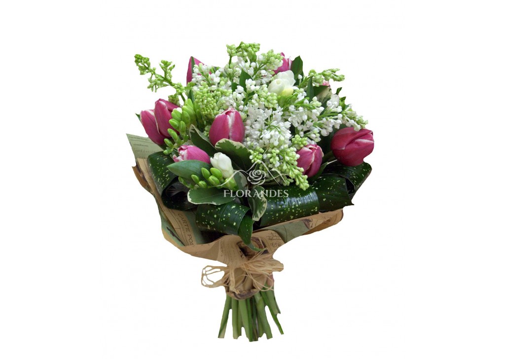 Buchet cu liliac alb, simplu si elegant, un cadou frumos pentru Sfintele Sarbatori de Pasti. Buchetul este compus din 3 liliac alb, 10 lalele mov, 6 frezii albe, frunze decorative, ziar special pentru flori si rafie naturala.