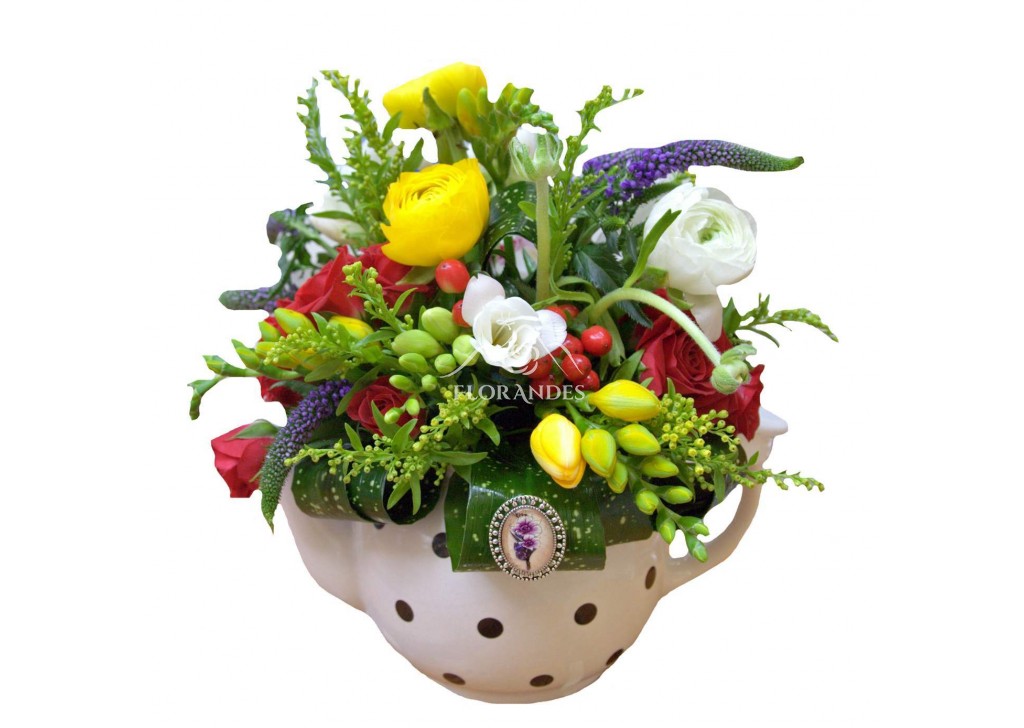 Ceainic cu veronica si frezii, vesel si cochet, in ton cu sarbatoarea Floriilor. Aranjamentul floral este compus din 1 cupa de orhidee cymbidium alba, 1 minitrandafir grena, 2 ranunculus galben, 2 ranunculus alb, 4 veronica, 1 solidago, 4 frezii galbene, 2 frezii albe, 3 hypericum rosu, 7 aspidistra milky way si brosa cadou.