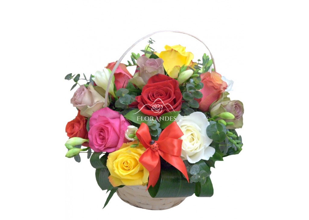 Cos parfumat si cochet, un cadou vesel pentru 1 sau 8 Martie. Cosul este compus din 13 trandafiri colorati, 8 frezii albe, 5 crengute de eucalipt, 5 frunze de aspidistra, 3 ruscus si fundita rosie din satin.